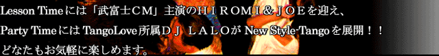 | イベント 「TangoLove-Night@GITANOS」は2003年9月10日をもって、ご好評のうち 終了致しました。多数のご来店本当にありがとうございました。 TangoLoveスタッフ一同 |